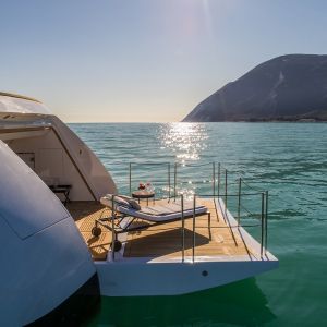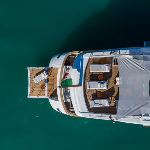 La lunghezza di 43 metri e il baglio di 8,10 metri coesistono con un pescaggio ridotto a soli 2,3 metri, che permette di raggiungere baie marine con fondali di bassa profondità.