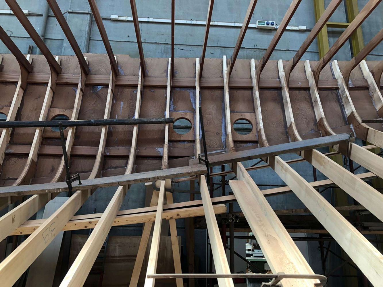 La costruzione dello scafo, della coperta e delle strutture è realizzata dal cantiere Castagnola con legni masselli incollati con resina epossidica caricata di silice, per una migliore adesione delle superfici, e compensati marini. La particolare forma della carena ha richiesto l’utilizzo di una trave di chiglia e di una controchiglia in iroko lamellare, di dimensioni variabili, che aumentano nella zona della ruota di prua. Data la forma molto particolare della prua, tutta la parte di fasciame in questa zona verrà realizzata in legno modellato, con cinque diversi strati di legno, disposti con fibre incrociate.