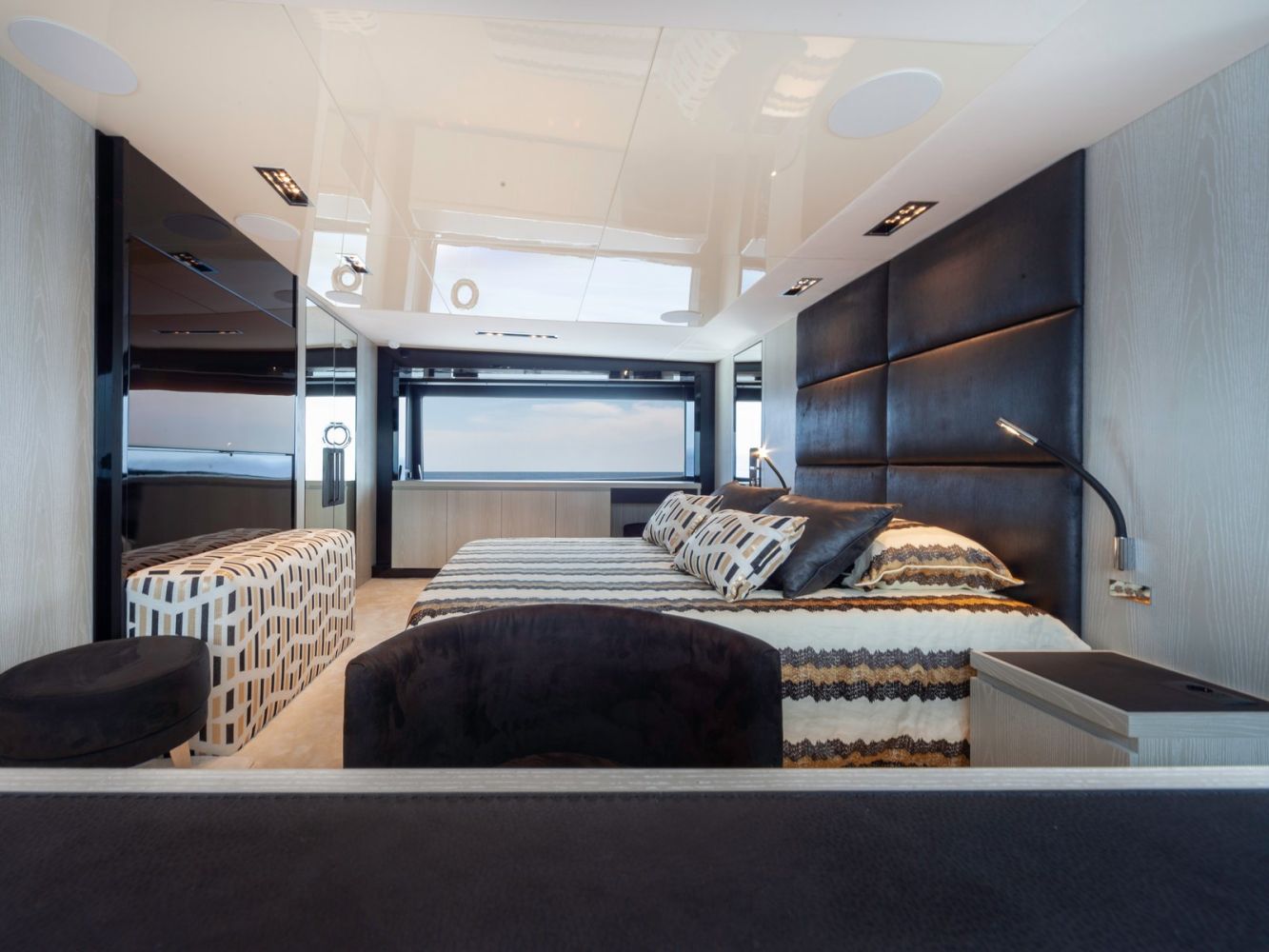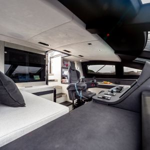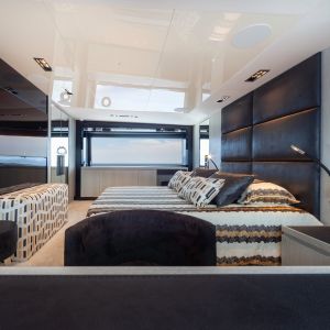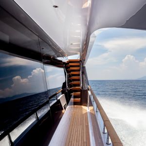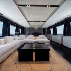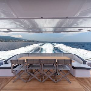 Questa unità presenta 5 cabine ma può essere realizzata anche nella versione con due, tre o quattro cabine per gli ospiti. Come per altre linee, Amer Yachts ha scelto di utilizzare il sughero per rivestire i ponti, materiale completamente riciclabile, ottimo per isolamento termico e sonoro.