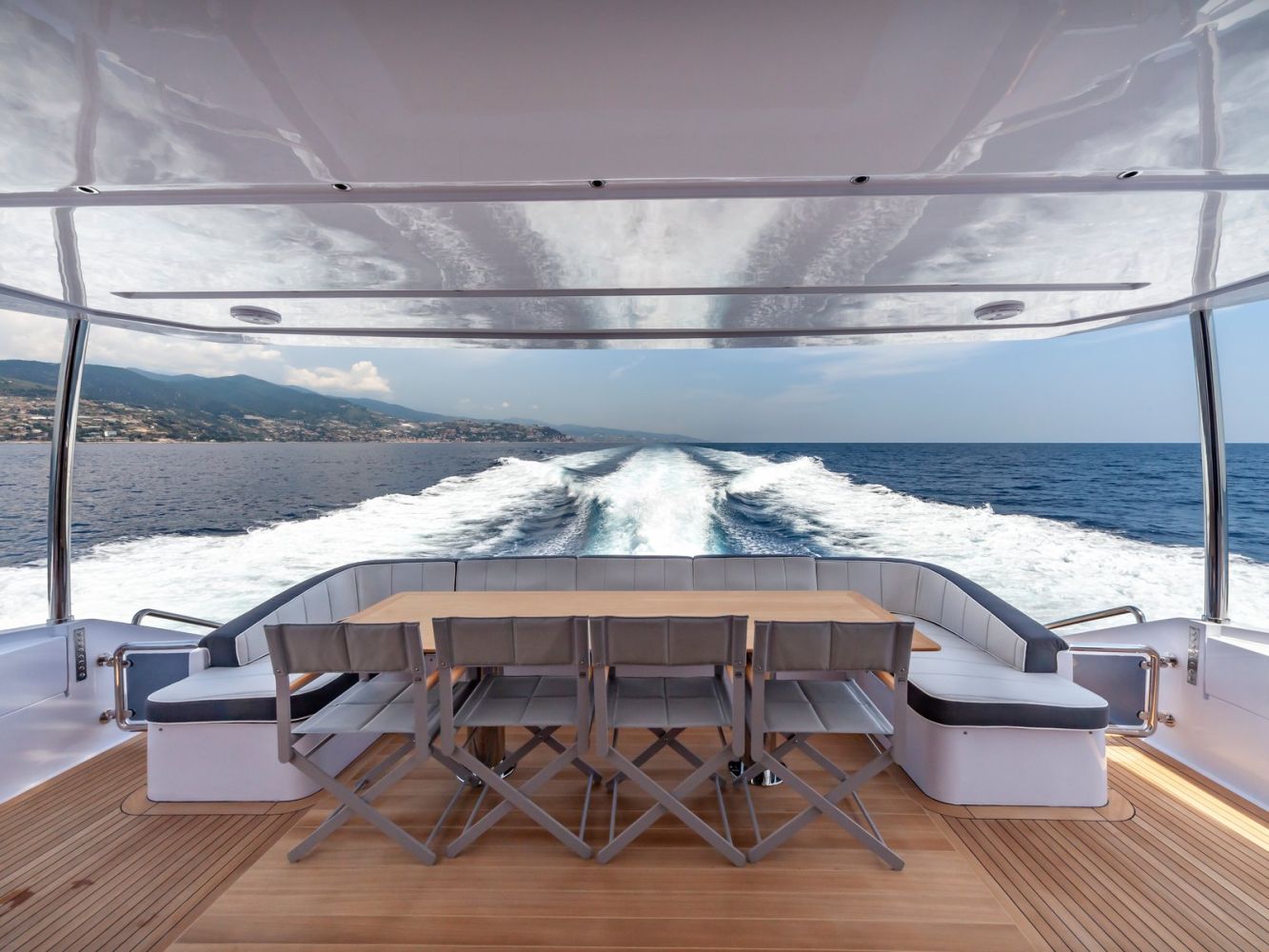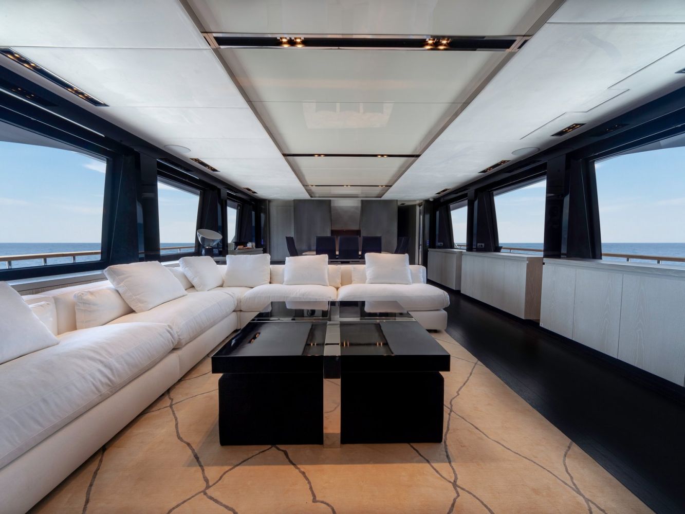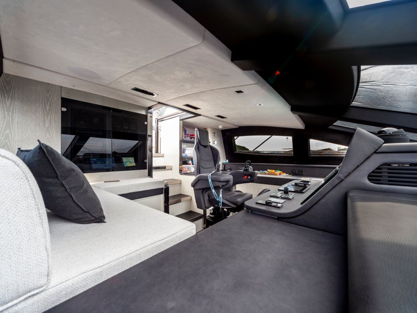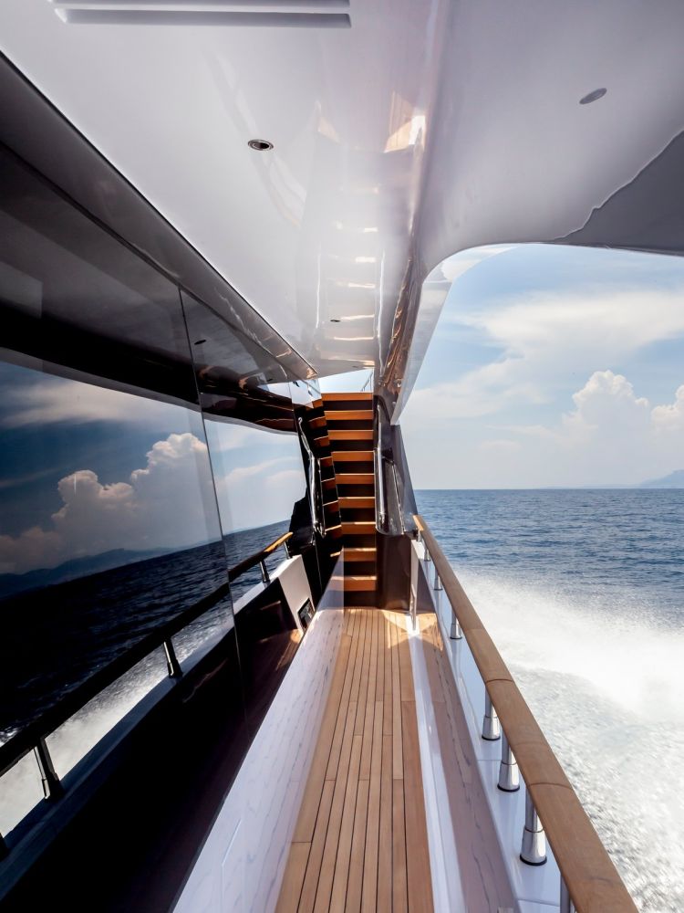 Oltre alle ottime qualità tecniche, Amer F100 risplende per le grandi finestrature realizzate nel salone principale che danno la sensazione di passeggiare costantemente sul mare.