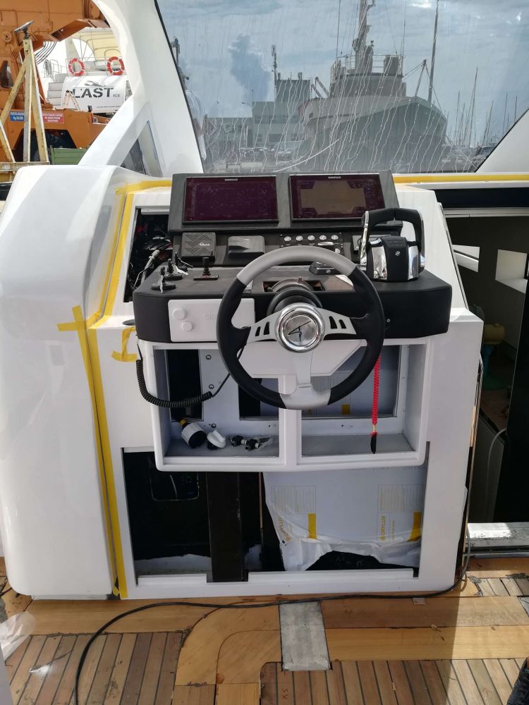 Per quanto riguarda la propulsione, la barca è dotata di tre fuoribordo Mercury Verado da 300 cavalli ciascuno per una velocità massima superiore ai 40 nodi.